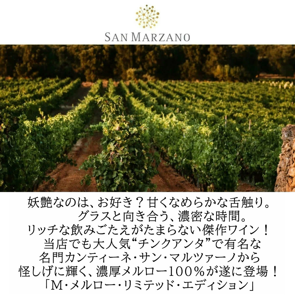 きめ細かいタンニンと濃縮した果実味の圧倒的な濃厚さで当店でも大人気の“チンクアンタ”で有名なカンティーネ・サン・マルツァーノから怪しげに輝く、濃厚メルローが登場!