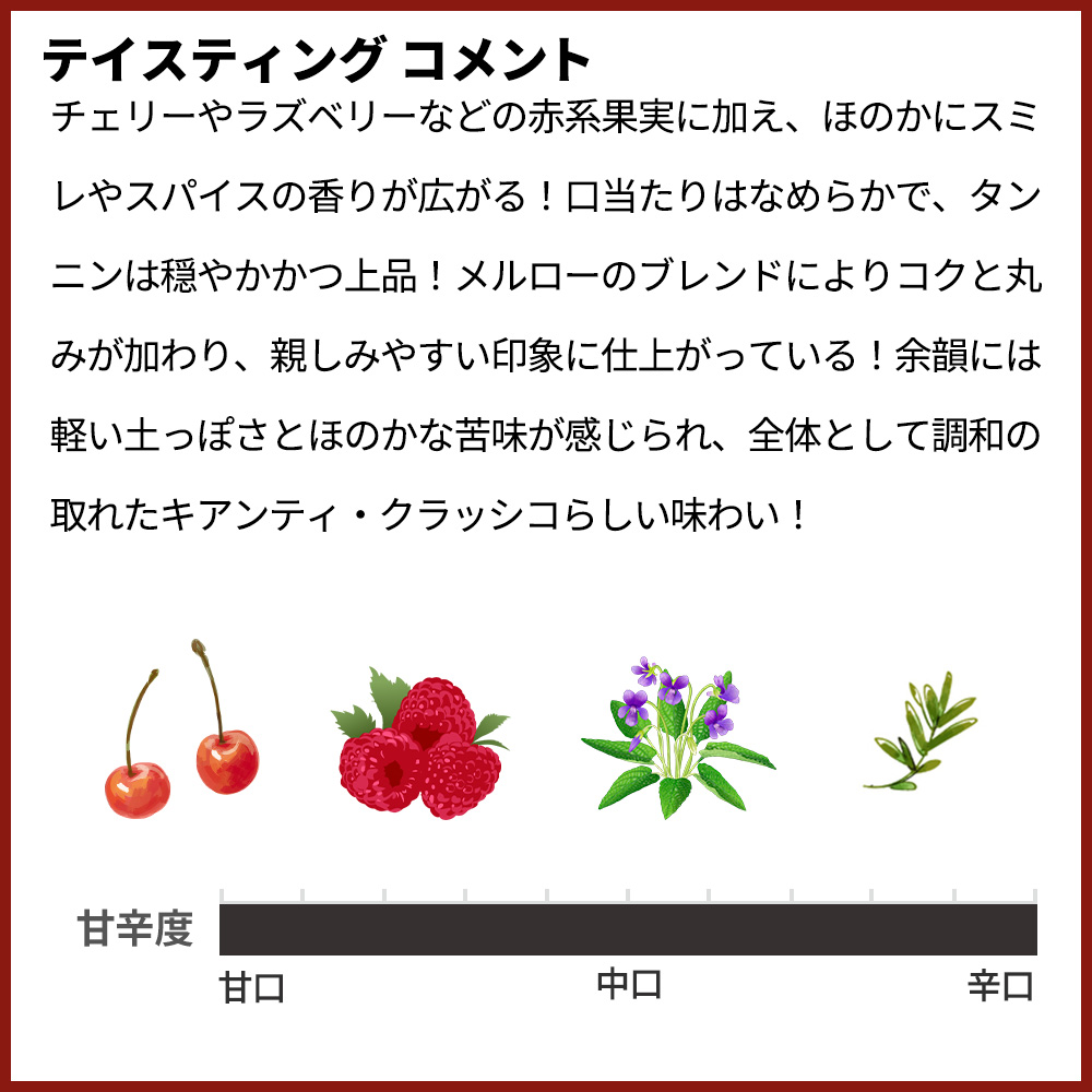 チェリーやラズベリーなどの赤系果実に加え、ほのかにスミレやスパイスの香りが広がる!口当たりはなめらかで、タンニンは穏やかかつ上品!メルローのブレンドによりコクと丸みが加わり、親しみやすい印象に仕上がっている!余韻には軽い土っぽさとほのかな苦味が感じられ、全体として調和の取れたキアンティ・クラッシコらしい味わい!