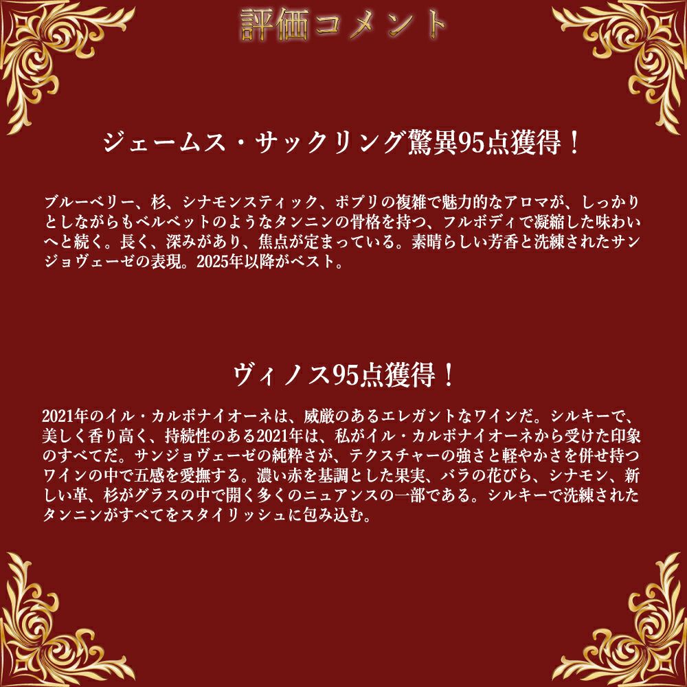 ヴィノス95点でコメントは「2021年のイル・カルボナイオーネは、威厳のあるエレガントなワインだ。シルキーで、美しく香り高く、持続性のある2021年は、私がイル・カルボナイオーネから受けた印象のすべてだ。サンジョヴェーゼの純粋さが、テクスチャーの強さと軽やかさを併せ持つワインの中で五感を愛撫する。濃い赤を基調とした果実、バラの花びら、シナモン、新しい革、杉がグラスの中で開く多くのニュアンスの一部である。シルキーで洗練されたタンニンがすべてをスタイリッシュに包み込む。」と大注目!