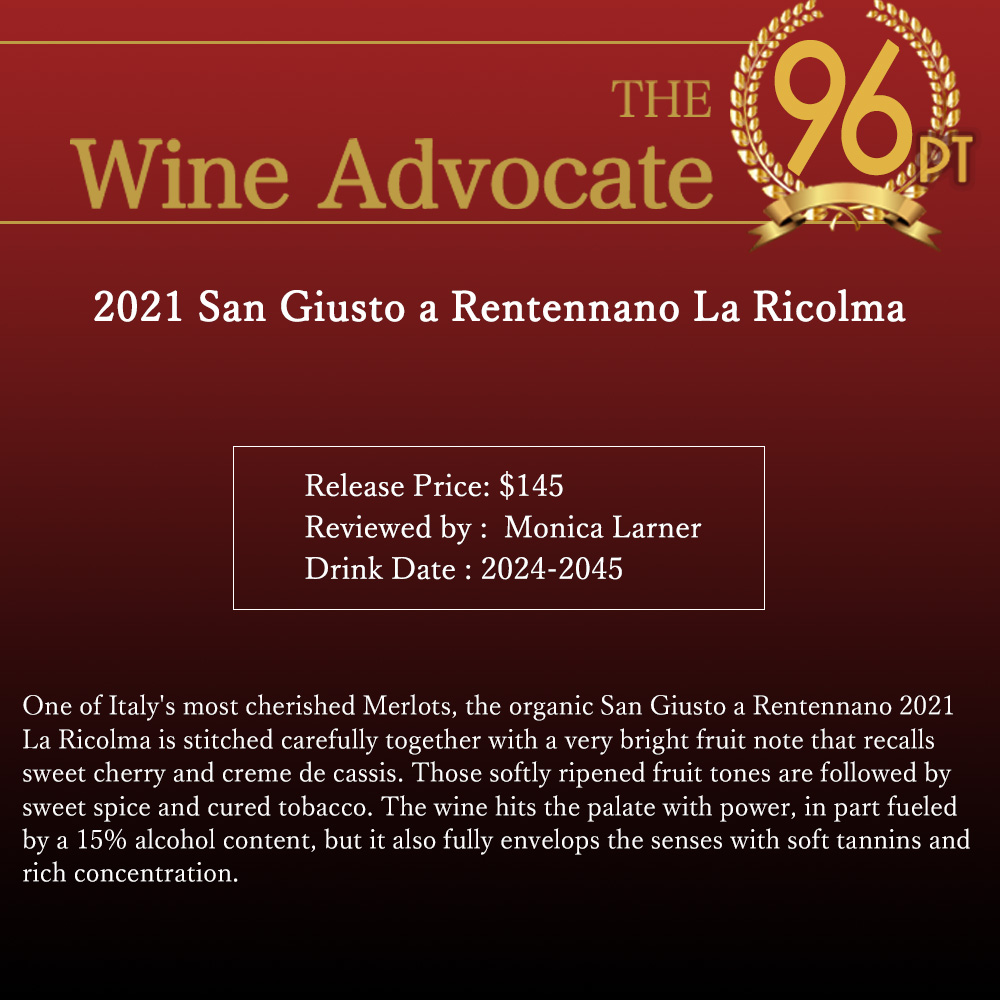 しかもワインアドヴォケイト誌における過去のコメントは「リコルマの前では言葉を失う程だ。文字にすら起こし難い。」と絶賛!この2021年も過去指折りの驚異の96点高評価 (リリース価格:$145) でコメントは『イタリアで最も愛されるメルローの一つ、有機栽培のサン・ジュスト・ア・レンテナーノ2021 ラ・リコルマは、甘いチェリーとクレーム・ド・カシスを思わせる非常に鮮やかな果実の香りを丁寧に織り交ぜている。柔らかく熟した果実のトーンに続き、甘いスパイスと熟成したタバコの香りが広がる。15%のアルコール度数も相まって、力強く口に広がるが、柔らかなタンニンと豊かな凝縮感が五感を完全に包み込む。』と大絶賛!