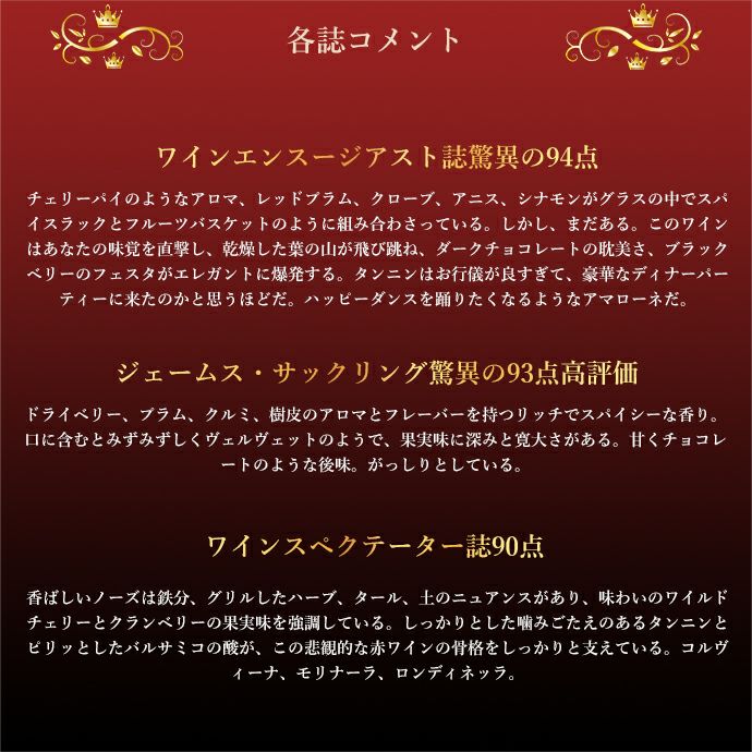 この2019年でワインエンスージアスト誌驚異の94点でコメントは「チェリーパイのようなアロマ、レッドプラム、クローブ、アニス、シナモンがグラスの中でスパイスラックとフルーツバスケットのように組み合わさっている。しかし、まだある。このワインはあなたの味覚を直撃し、乾燥した葉の山が飛び跳ね、ダークチョコレートの耽美さ、ブラックベリーのフェスタがエレガントに爆発する。タンニンはお行儀が良すぎて、豪華なディナーパーティーに来たのかと思うほどだ。ハッピーダンスを踊りたくなるようなアマローネだ。」と激賞!