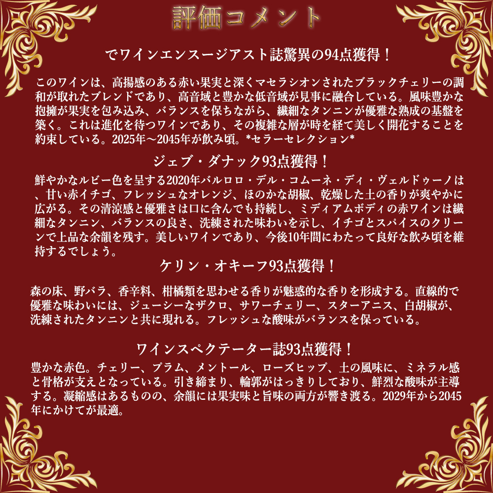 ジェブ・ダナック93点獲得!絶賛コメントは『鮮やかなルビー色を呈する2020年バルロロ・デル・コムーネ・ディ・ヴェルドゥーノは、甘い赤イチゴ、フレッシュなオレンジ、ほのかな胡椒、乾燥した土の香りが爽やかに広がる。その清涼感と優雅さは口に含んでも持続し、ミディアムボディの赤ワインは繊細なタンニン、バランスの良さ、洗練された味わいを示し、イチゴとスパイスのクリーンで上品な余韻を残す。美しいワインであり、今後10年間にわたって良好な飲み頃を維持するでしょう。』!