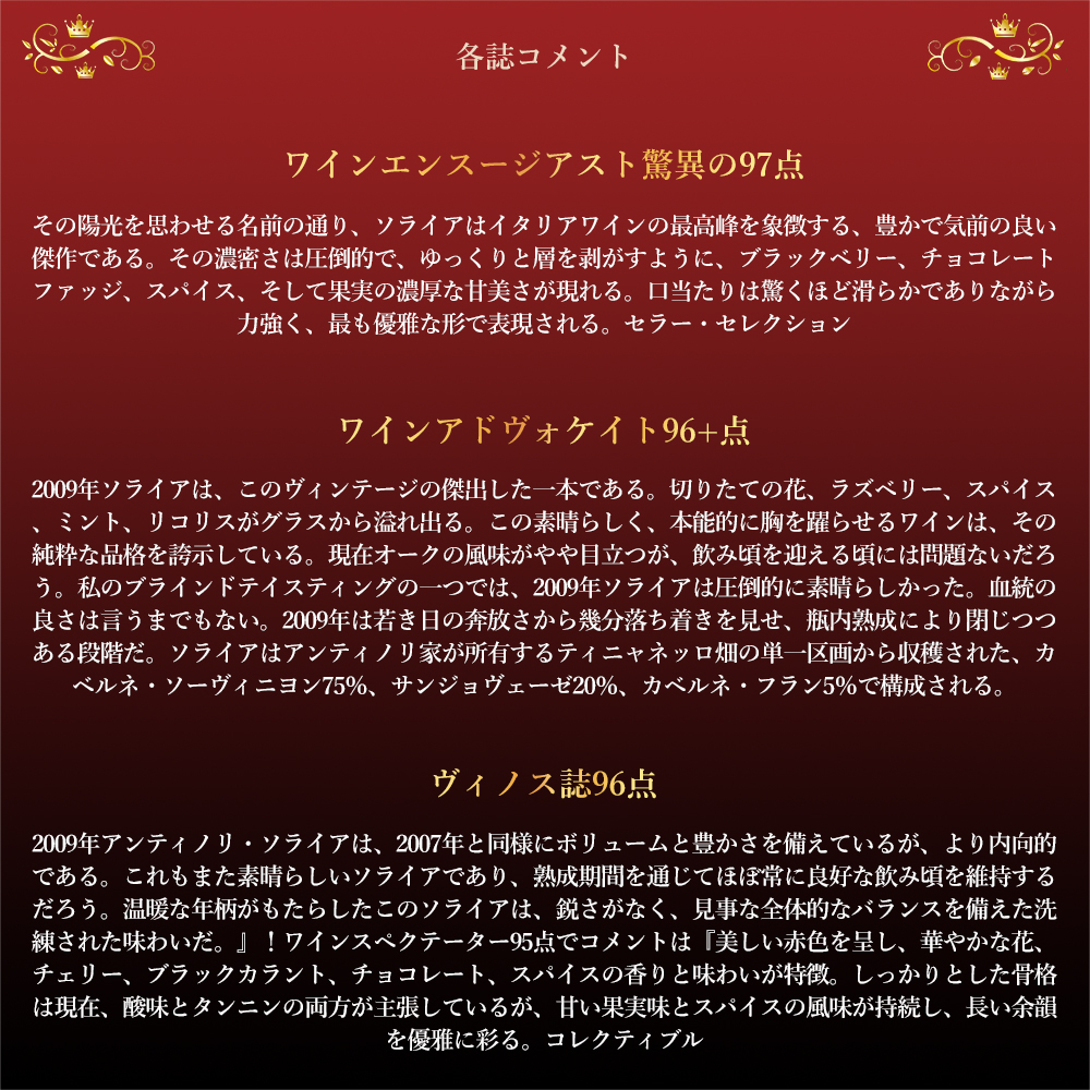 ワインアドヴォケイト96+点でコメントは『2009年ソライアは、このヴィンテージの傑出した一本である。切りたての花、ラズベリー、スパイス、ミント、リコリスがグラスから溢れ出る。この素晴らしく、本能的に胸を躍らせるワインは、その純粋な品格を誇示している。現在オークの風味がやや目立つが、飲み頃を迎える頃には問題ないだろう。私のブラインドテイスティングの一つでは、2009年ソライアは圧倒的に素晴らしかった。血統の良さは言うまでもない。2009年は若き日の奔放さから幾分落ち着きを見せ、瓶内熟成により閉じつつある段階だ。ソライアはアンティノリ家が所有するティニャネッロ畑の単一区画から収穫された、カベルネ・ソーヴィニヨン75%、サンジョヴェーゼ20%、カベルネ・フラン5%で構成される。』!