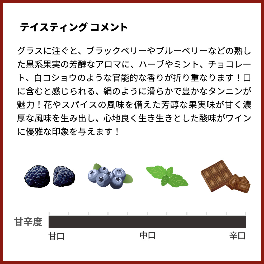 - ブドウ品種カベルネ・ソーヴィニヨン75%、サンジョヴェーゼ20%、カベルネ・フラン5%