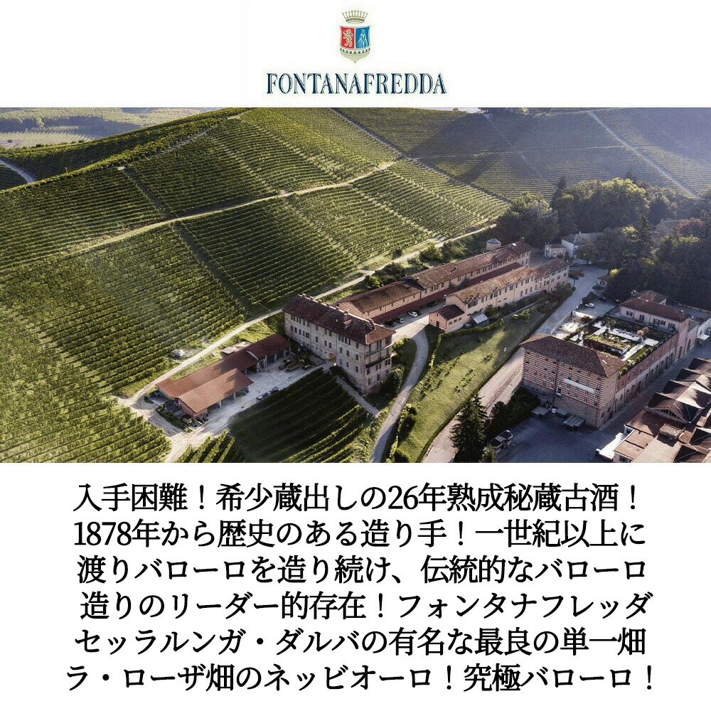 伝統的なバローロ造りのリーダー的存在!フォンタナフレッダ社による、自社畑の中でも非常にすばらしい畑の一つ!セッラルンガ・ダルバ村の“ラ・ローザ”畑!海抜250-310mの南南西に開けた銘醸畑からの、樹齢33-34年のネッビオーロをフランス アリエ産のオーク樽 (新樽50%) で1年!2000-3000Lの木樽に移し1年、ボトリングして1年の、計3年熟成!その後しかもフォンタナフレッダ社のセラーでの素晴らしい環境の下で25年の歳月をすごした究極フルボディ赤ワイン!