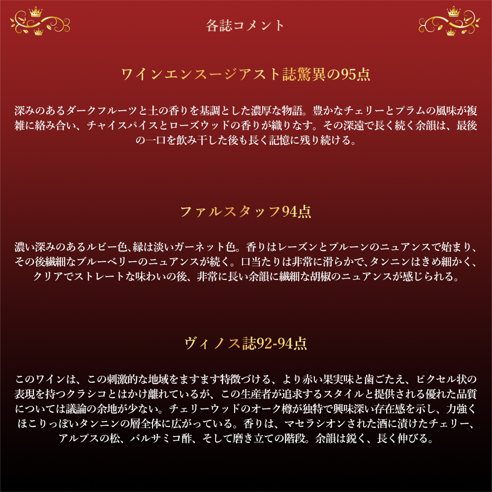 ジェームス・サックリング94点でコメントは『このワインは、この刺激的な地域をますます特徴づける、より赤い果実味と歯ごたえ、ピクセル状の表現を持つクラシコとはかけ離れているが、この生産者が追求するスタイルと提供される優れた品質については議論の余地が少ない。チェリーウッドのオーク樽が独特で興味深い存在感を示し、力強くほこりっぽいタンニンの層全体に広がっている。香りは、マセラシオンされた酒に漬けたチェリー、アルプスの松、バルサミコ酢、そして磨き立ての階段。余韻は鋭く、長く伸びる。』!