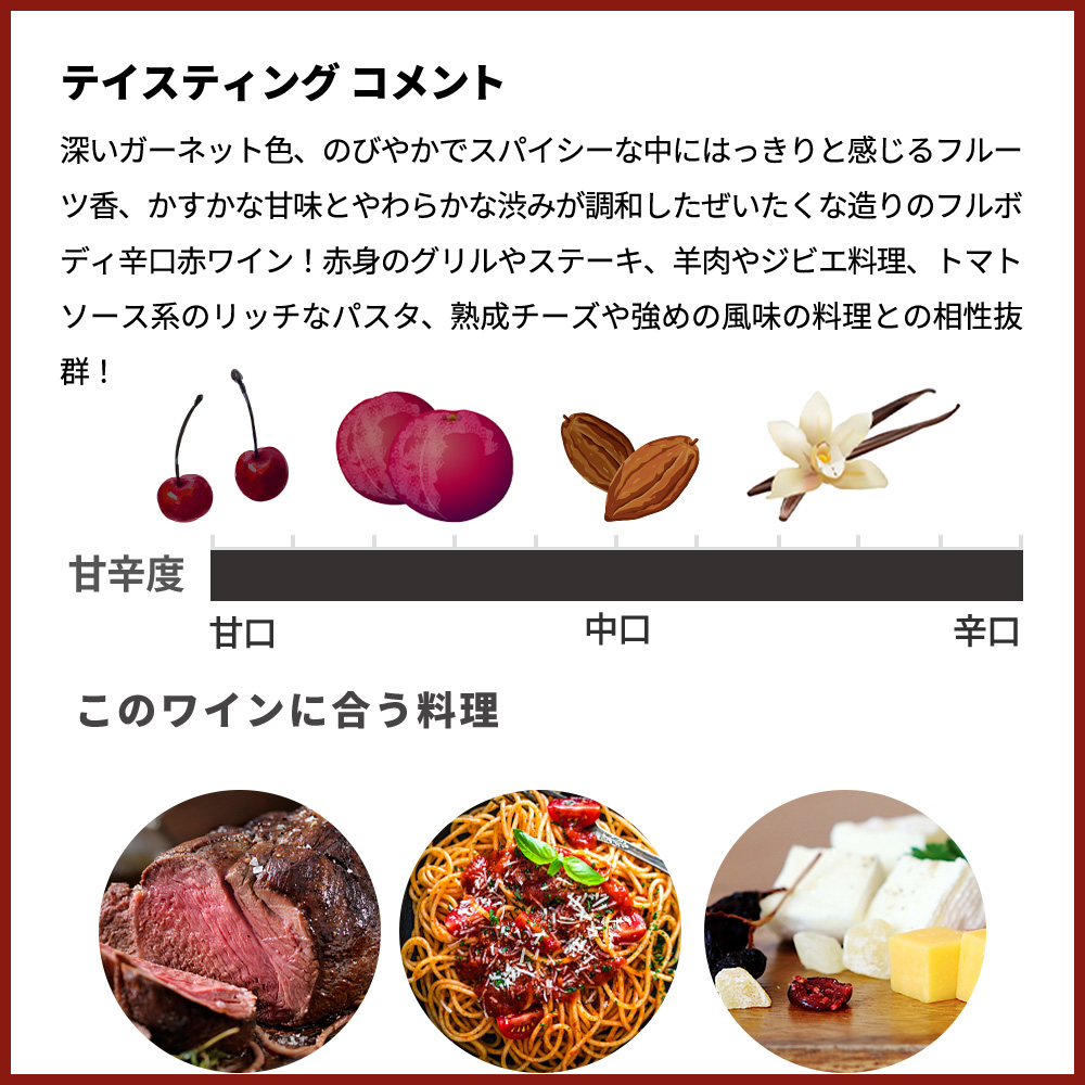 「凝縮感のある果実味がまず広がり、熟したブラックチェリーやプラムを思わせる甘やかなニュアンスに、スパイスやカカオ、ほのかなバニラ香が重なります。タンニンは豊富ながらきめ細かく、丸みがあって口当たりは滑らか。しっかりした骨格と酸のバランスが良く、力強さの中に上品さがあります。余韻は長く、果実味と樽由来の香ばしさが調和しながら心地よく続く、完成度の高い味わい。」