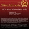 このバルバレスコ・ヴィニェート“スタルデリ”[2007]年でワインアドヴォケイト誌驚異の94点で「2007年バルバレスコ・ヴィニェート・スタルデリは、グラスから赤いベリー、甘いスパイス、バラ、ミントの香りが爆発的に広がる。これら全てが、ネイヴェ産バルバレスコの代名詞である力強く豊かな骨格の上で調和する。スタルデリは当ワイナリーの2007年ヴィンテージの中で最もタンニンが強く、しかし非常に優れた飲み頃を迎えるまでの長い道のりを約束するワインである。予想される熟成ピーク:2017年~2027年」と高評価!