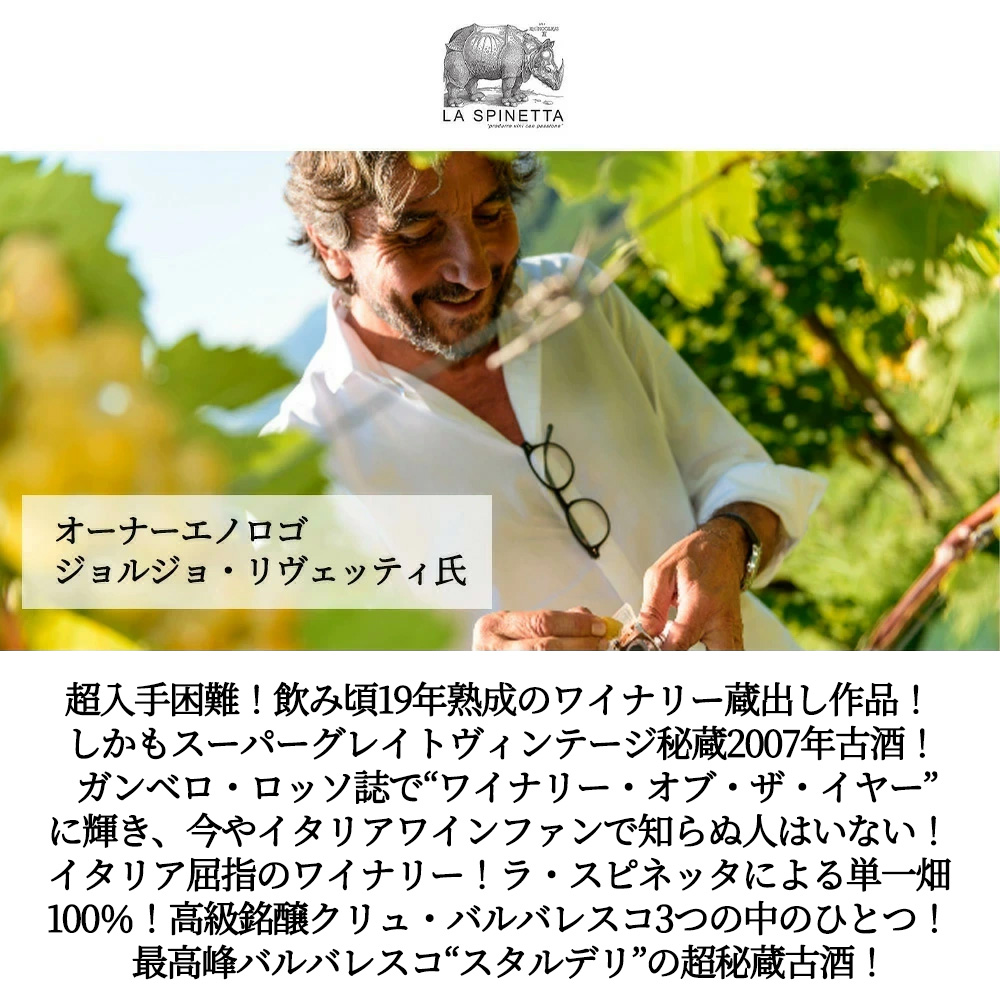 濃い赤色!赤いベリー、甘いスパイス、バラ、ミントの香り!口に含んだ瞬間なめらかさを感じます!その後にミネラル感としっかりとした酸味、熟したタンニンをダイレクトに感じます!タンニンがストラクチャーの形成し、しなやかさと凝縮感が口の中を満たしていきます!ラ・スピネッタのバルバレスコの中で“最も芳醇でグラマーな味わい”スタルデリの今や非常に希少な19年熟成の飲み頃ヴィンテージで高評価[2007]年ものが、正規代理店輸入品で限定少量入荷!