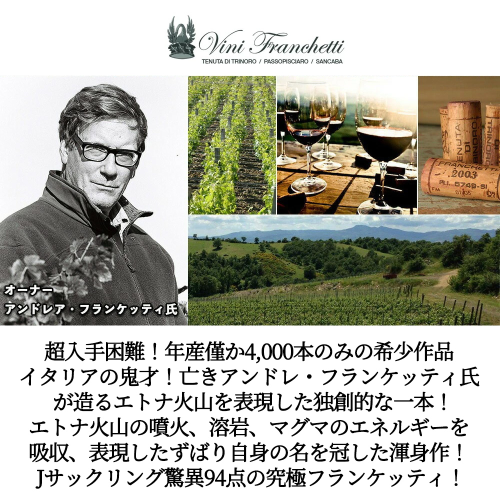 アンドレア・フランケッティ氏が2021年12月5日に逝去されました!今後のリリースを含め、現在、詳しい詳細は分かっておりませんが、世界的に入手困難!あのテヌータ・ディ・トリノーロを世に送り出したイタリア トスカーナの鬼才、アンドレア・フランケッティ氏が、トップクラスの名声を獲得しながらも、そのポテンシャルに惹かれ、未だ火山活動を続ける太陽溢れるシチリア!のエトナ火山の北斜面の、なんと標高1000mを越える場所 (火山灰と溶岩が風化したミネラルに富む) で、これまた通もうなづくボルドーの希少品種プティ・ヴェルド種70%にチェザネーゼ・ダッフィーレ種30%をなんと!ロマネ・コンティもまっ青の驚異の低収量で造り上げた奇才フランケッティ氏の超自信作!1,000mの標高まで畑は広がっており、100を超える細かな段々畑で構成されるコントラーダ (区画) グアルディオーラの畑からの厳選プティ・ヴェルド70%にチェザネーゼ30%をフレンチオークの新樽100% (225L) で6ヶ月+セメントタンクで12ヶ月熟成の、驚異の計18ヶ月熟成!