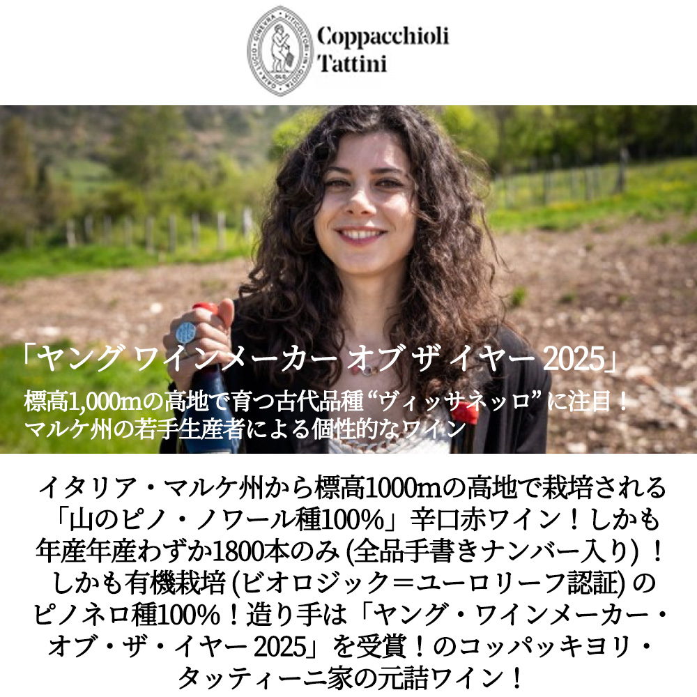 ピッコレ・プロドゥツィオーニ・ピノ・ネーロ[2024]年・蔵出し限定作品・コッパッキヨリ・タッティーニ家(オーナー・ジネヴラ・コッパッキヨリ家)元詰(「ヤング・ワインメーカー・オブ・ザ・イヤー 2025」を受賞)・有機栽培(ビオロジック=ユーロリーフ認証)・大樽で6ヶ月熟成・年産わずか1800本のみ(全品手書きナンバー入り)(ランダムに3種類のラベル入り)・I.G.P.マルケ(標高1000mの高地栽培の「山のピノ・ノワール種100%」)・ロウ封印キャップ・エコセール認証