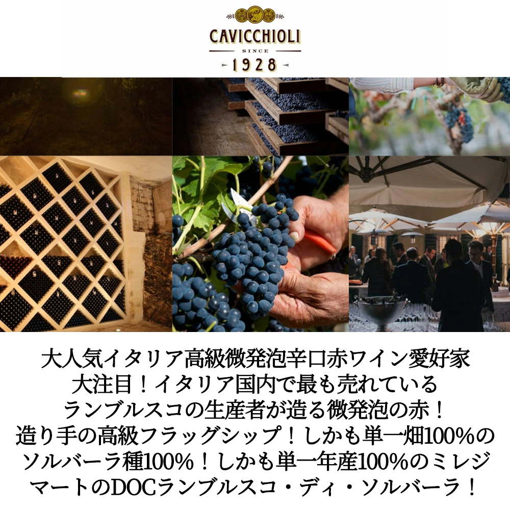 美味しくてグルメなエミリア・ロマーニャ州のNo1ランブルスコ・カビッキオーリ!ピンクがかった美しい淡いルビー色に、スミレの花のような華やかな香りと繊細な味わいが魅力の大人気こだわりランブルスコ!きめ細かく凝縮された果実味が印象的な辛口赤の微発泡!単一畑のソルバーラ種100%で造られるカビッキオーリのフラッグシップ!が正規品で限定で少量入荷!