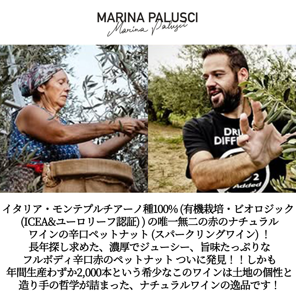 入手困難!イタリア・アブルッツオ州・モンテプルチアーノ種100% (有機栽培・ビオロジック (ICEA&ユーロリーフ認証) ) の唯一無二の赤のナチュラルワインの辛口ペットナット (スパークリングワイン) !長年探し求めた、濃厚でジューシー、旨味たっぷりなフルボディ辛口赤のペットナット ついに発見!!しかもユーロリーフ認定!自然の力と造り手の遊び心が融合した、唯一無二のスパークリング赤!しかも年間生産わずか2,000本という稀少なこのワインは土地の個性と造り手の哲学が詰まった、ナチュラルワインの逸品です!
