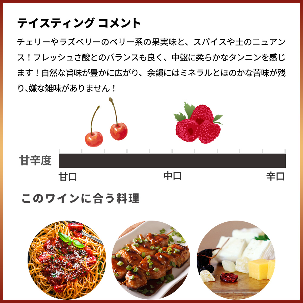 色は濃いルビーレッドの珍しい赤のペティヤン!チェリーやラズベリーのベリー系の果実味と、スパイスや土のニュアンス!フレッシュさ酸とのバランスも良く、中盤に柔らかなタンニンを感じます!自然な旨味が豊かに広がり、余韻にはミネラルとほのかな苦味が残り、嫌な雑味がありません!澱とともに熟成することで、時間とともに香りと味わいが深まるのも魅力です!お料理は炭火焼きの肉料理、トマトベースのパスタ、熟成チーズ、和食なら照り焼きや焼き鳥などと合わせていただくのがおすすめです!