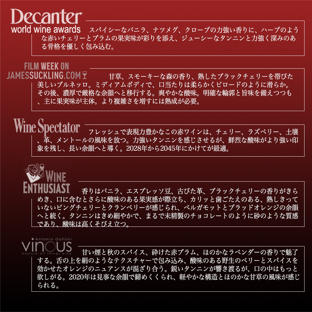 ジェームス・サックリング94点でコメントは「甘草、スモーキーな森の香り、熟したブラックチェリーを帯びた美しいブルネッロ。ミディアムボディで、口当たりは柔らかくビロードのように滑らか。その後、濃厚で厳格な余韻へと移行する。爽やかな酸味。明確な輪郭と旨味を備えつつも、主に果実味が主体。より複雑さを増すには熟成が必要。」!