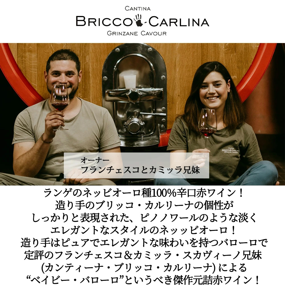 造り手はピュアでエレガントな味わいを持つバローロで定評のフランチェスコ&カミッラ・スカヴィーノ兄妹が2014年に設立したグリンツァーネ・カヴールの注目の生産者のカンティーナ・ブリッコ・カルリーナ!