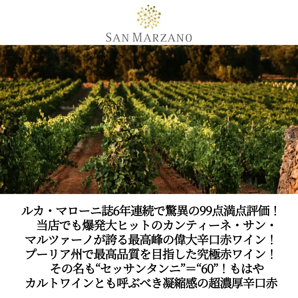 当店でも大人気のカンティーネ・サン・マルツァーノの最高級赤ワイン!その名も“セッサンタンニ”=“60”!プーリア州最高品質を目指したワイン!創業当時 (1950年代) から残るアルベレッロ (ブッシュヴァイン) 仕立てで植えられた樹齢60年以上の古木プリミティーヴォから生み出される、超凝縮した貴重なブドウをさらにセレクション、熟成に使用するバリックの産地にもこだわり抜いた、まさにプーリアのいぶし銀的なワイン!樹齢60年以上のプリミティーヴォ種100%をオーク樽12ヶ月 (100%フランス産) 、ステンレス・タンク12ヶ月で瓶熟6ヶ月以上 (計24カ月以上の熟成を経て) でリリースされるブラックチェリーやプルーンなどのアロマにタバコやスパイスのニュアンスが混ざり合う、複雑で広がりのある香り!バニラやチョコレートやコーヒーのような甘やかな余韻が続く、もはやカルトワインとも呼ぶべき凝縮感の超フルボディ辛口赤ワイン!