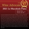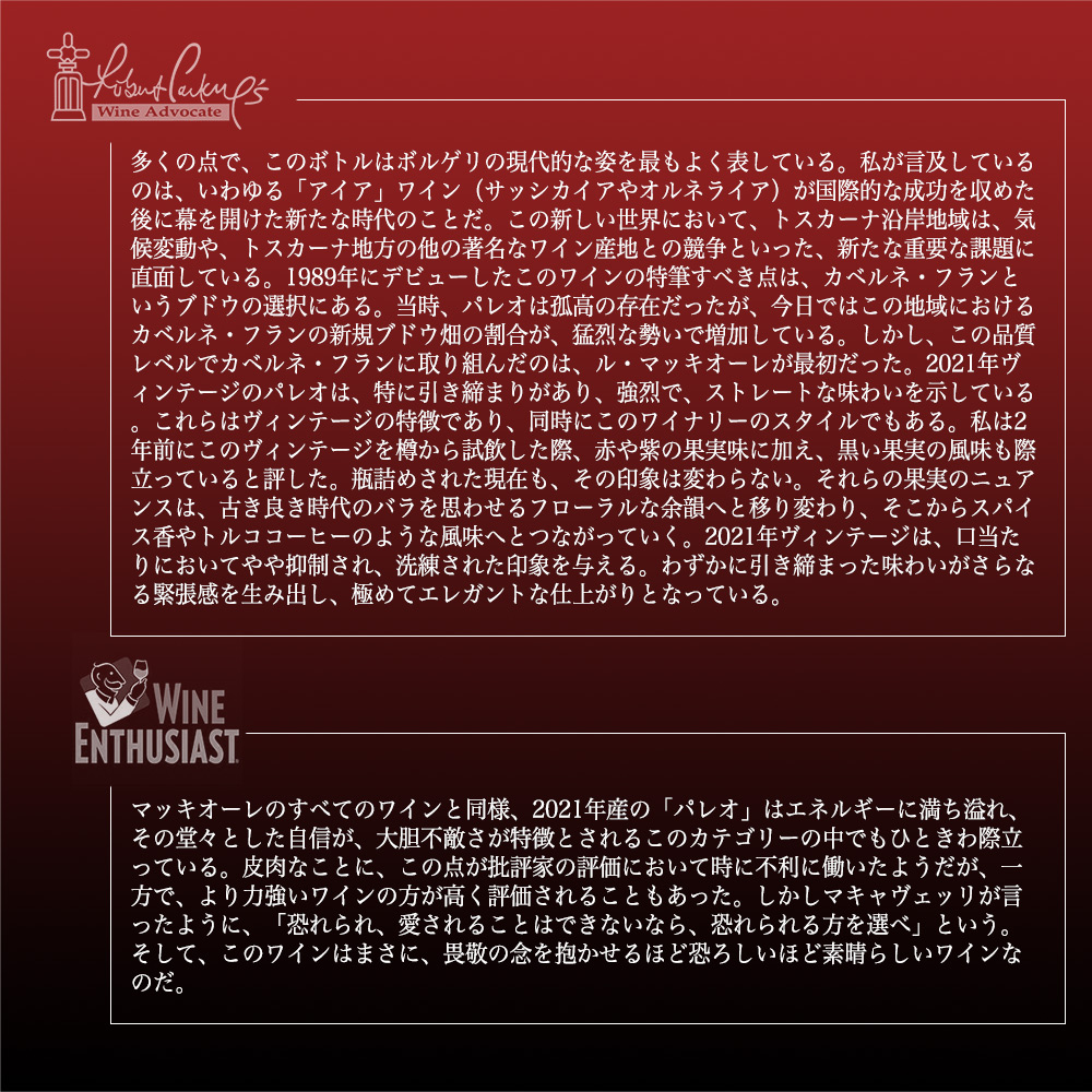 ワインエンスージアスト誌98点でコメントは「マッキオーレのすべてのワインと同様、2021年産の「パレオ」はエネルギーに満ち溢れ、その堂々とした自信が、大胆不敵さが特徴とされるこのカテゴリーの中でもひときわ際立っている。皮肉なことに、この点が批評家の評価において時に不利に働いたようだが、一方で、より力強いワインの方が高く評価されることもあった。しかしマキャヴェッリが言ったように、「恐れられ、愛されることはできないなら、恐れられる方を選べ」という。そして、このワインはまさに、畏敬の念を抱かせるほど恐ろしいほど素晴らしいワインなのだ。」!