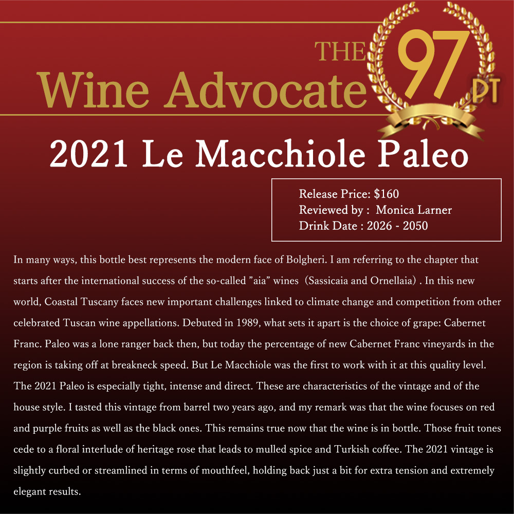 この2021年でワインアドヴォケイト誌驚異97点でコメントは「多くの点で、このボトルはボルゲリの現代的な姿を最もよく表している。私が言及しているのは、いわゆる「アイア」ワイン(サッシカイアやオルネライア)が国際的な成功を収めた後に幕を開けた新たな時代のことだ。この新しい世界において、トスカーナ沿岸地域は、気候変動や、トスカーナ地方の他の著名なワイン産地との競争といった、新たな重要な課題に直面している。1989年にデビューしたこのワインの特筆すべき点は、カベルネ・フランというブドウの選択にある。当時、パレオは孤高の存在だったが、今日ではこの地域におけるカベルネ・フランの新規ブドウ畑の割合が、猛烈な勢いで増加している。しかし、この品質レベルでカベルネ・フランに取り組んだのは、ル・マッキオーレが最初だった。2021年ヴィンテージのパレオは、特に引き締まりがあり、強烈で、ストレートな味わいを示している。これらはヴィンテージの特徴であり、同時にこのワイナリーのスタイルでもある。私は2年前にこのヴィンテージを樽から試飲した際、赤や紫の果実味に加え、黒い果実の風味も際立っていると評した。瓶詰めされた現在も、その印象は変わらない。それらの果実のニュアンスは、古き良き時代のバラを思わせるフローラルな余韻へと移り変わり、そこからスパイス香やトルココーヒーのような風味へとつながっていく。2021年ヴィンテージは、口当たりにおいてやや抑制され、洗練された印象を与える。わずかに引き締まった味わいがさらなる緊張感を生み出し、極めてエレガントな仕上がりとなっている。」!