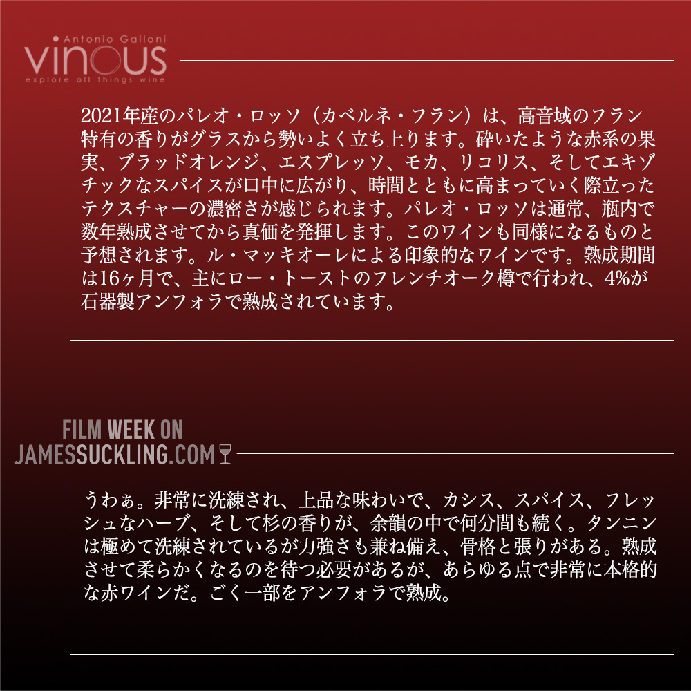 ヴィノス97点でコメントは「2021年産のパレオ・ロッソ(カベルネ・フラン)は、高音域のフラン特有の香りがグラスから勢いよく立ち上ります。砕いたような赤系の果実、ブラッドオレンジ、エスプレッソ、モカ、リコリス、そしてエキゾチックなスパイスが口中に広がり、時間とともに高まっていく際立ったテクスチャーの濃密さが感じられます。パレオ・ロッソは通常、瓶内で数年熟成させてから真価を発揮します。このワインも同様になるものと予想されます。ル・マッキオーレによる印象的なワインです。熟成期間は16ヶ月で、主にロー・トーストのフレンチオーク樽で行われ、4%が石器製アンフォラで熟成されています。」!