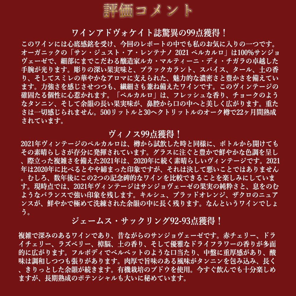 2021年で、ワインアドヴォケイト誌驚異の99点でコメントは『このワインには心底感銘を受け、今回のレポートの中でも私のお気に入りの一つです。オーガニックの「サン・ジュスト・ア・レンテナノ 2021 ペルカルロ」は100%サンジョヴェーゼで、細部にまでこだわる醸造家ルカ・マルティーニ・ディ・チガラの卓越した手腕が光ります。彫りの深い果実味と、ブラックカラント、スパイス、タール、土の香り、そしてスミレの華やかなアロマに支えられた、魅力的な濃密さと豊かさを備えています。力強さを感じさせつつも、繊細さも兼ね備えたワインです。このヴィンテージの確固たる個性に心惹かれます。「ペルカルロ」は、フレッシュな香り、チョークのようなタンニン、そして余韻の長い果実味が、鼻腔から口の中へと美しく広がります。重たさは一切感じられません。500リットルと30ヘクトリットルのオーク樽で22ヶ月間熟成されています。』!