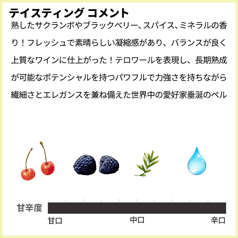 濃いルビー色!熟したサクランボやブラックベリー、スパイス、ミネラルの香り!フレッシュで素晴らしい凝縮感があり、バランスが良く上質なワインに仕上がった!テロワールを表現し、長期熟成が可能なポテンシャルを持つパワフルで力強さを持ちながら繊細さとエレガンスを兼ね備えた世界中の愛好家垂涎のペルカルロが極少量入荷!