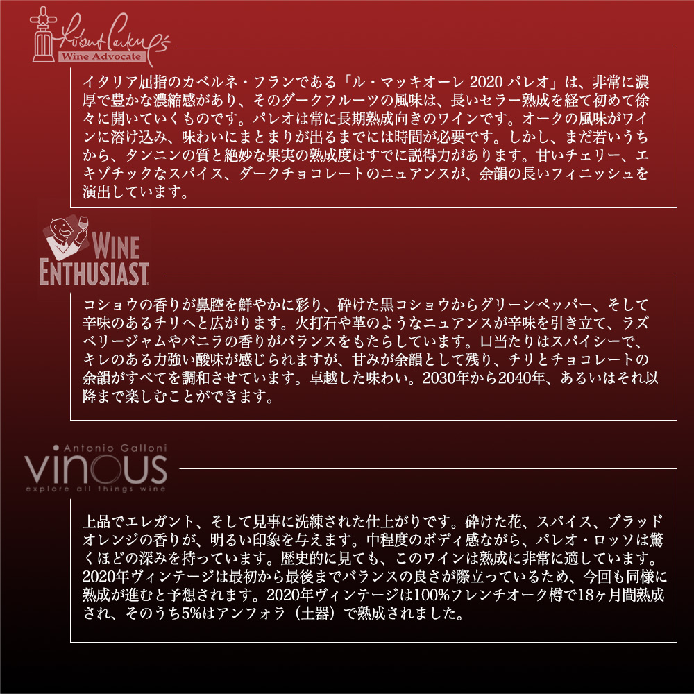 この2020年でワインアドヴォケイト誌驚異96点でコメントは『イタリア屈指のカベルネ・フランである「ル・マッキオーレ 2020 パレオ」は、非常に濃厚で豊かな濃縮感があり、そのダークフルーツの風味は、長いセラー熟成を経て初めて徐々に開いていくものです。パレオは常に長期熟成向きのワインです。オークの風味がワインに溶け込み、味わいにまとまりが出るまでには時間が必要です。しかし、まだ若いうちから、タンニンの質と絶妙な果実の熟成度はすでに説得力があります。甘いチェリー、エキゾチックなスパイス、ダークチョコレートのニュアンスが、余韻の長いフィニッシュを演出しています。』!