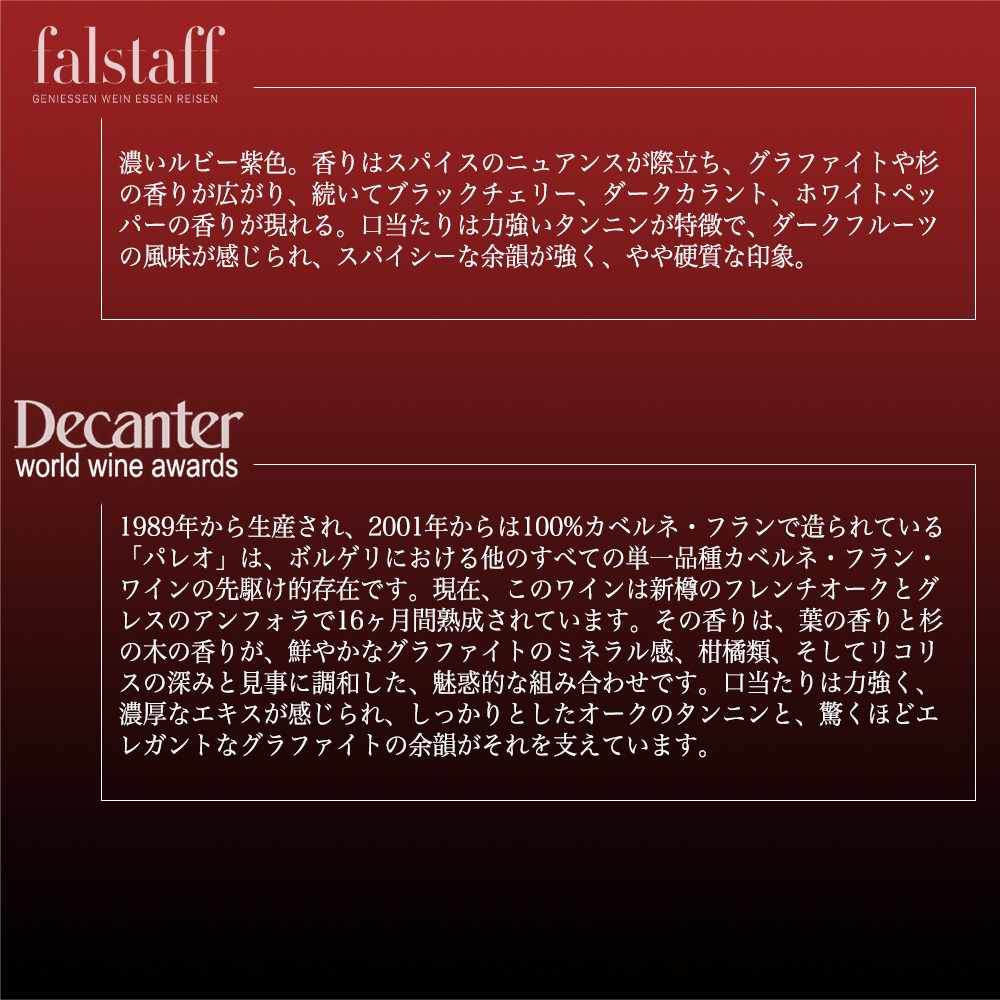 デカンタ95点でコメントは『1989年から生産され、2001年からは100%カベルネ・フランで造られている「パレオ」は、ボルゲリにおける他のすべての単一品種カベルネ・フラン・ワインの先駆け的存在です。現在、このワインは新樽のフレンチオークとグレスのアンフォラで16ヶ月間熟成されています。その香りは、葉の香りと杉の木の香りが、鮮やかなグラファイトのミネラル感、柑橘類、そしてリコリスの深みと見事に調和した、魅惑的な組み合わせです。口当たりは力強く、濃厚なエキスが感じられ、しっかりとしたオークのタンニンと、驚くほどエレガントなグラファイトの余韻がそれを支えています。』!