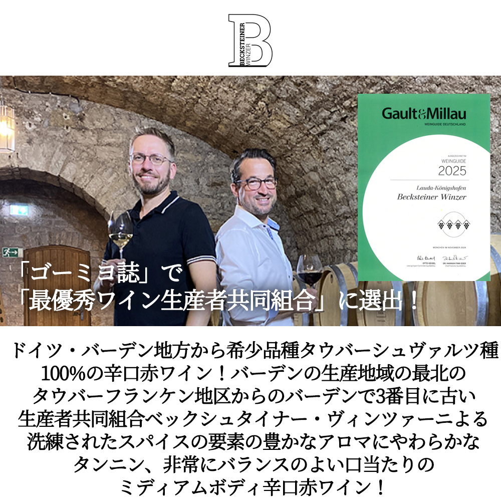 バーデンの生産地域の最北となるタウバーフランケン地区 (タウバーフランケン地方は歴史的には1803年まではフランケン地方の一部でした。そのため、フランケンの伝統的ボトル、ボックスボイテルを使用することが認められています。) に位置し、バーデンで3番目に古い生産者共同組合ベックシュタイナー・ヴィンツァーから、かつて絶滅したと考えられていた希少な土着ブドウ品種で珍しいタウバーシュヴァルツ種100% (タウバーシュヴァルツ種はタウバータールの土着品種です。かつては絶滅したと考えられていましたが、1960年頃、国立ワイン栽培教育試験所により繁殖が行われ、これによってこの希少な品種が保存されるようになりました。1980年代以降、タウバーシュヴァルツ種は再び栽培が行われるようになり、繊細な果実味と個性的な赤ワインとして人気があります。) から生まれる希少赤ワイン!