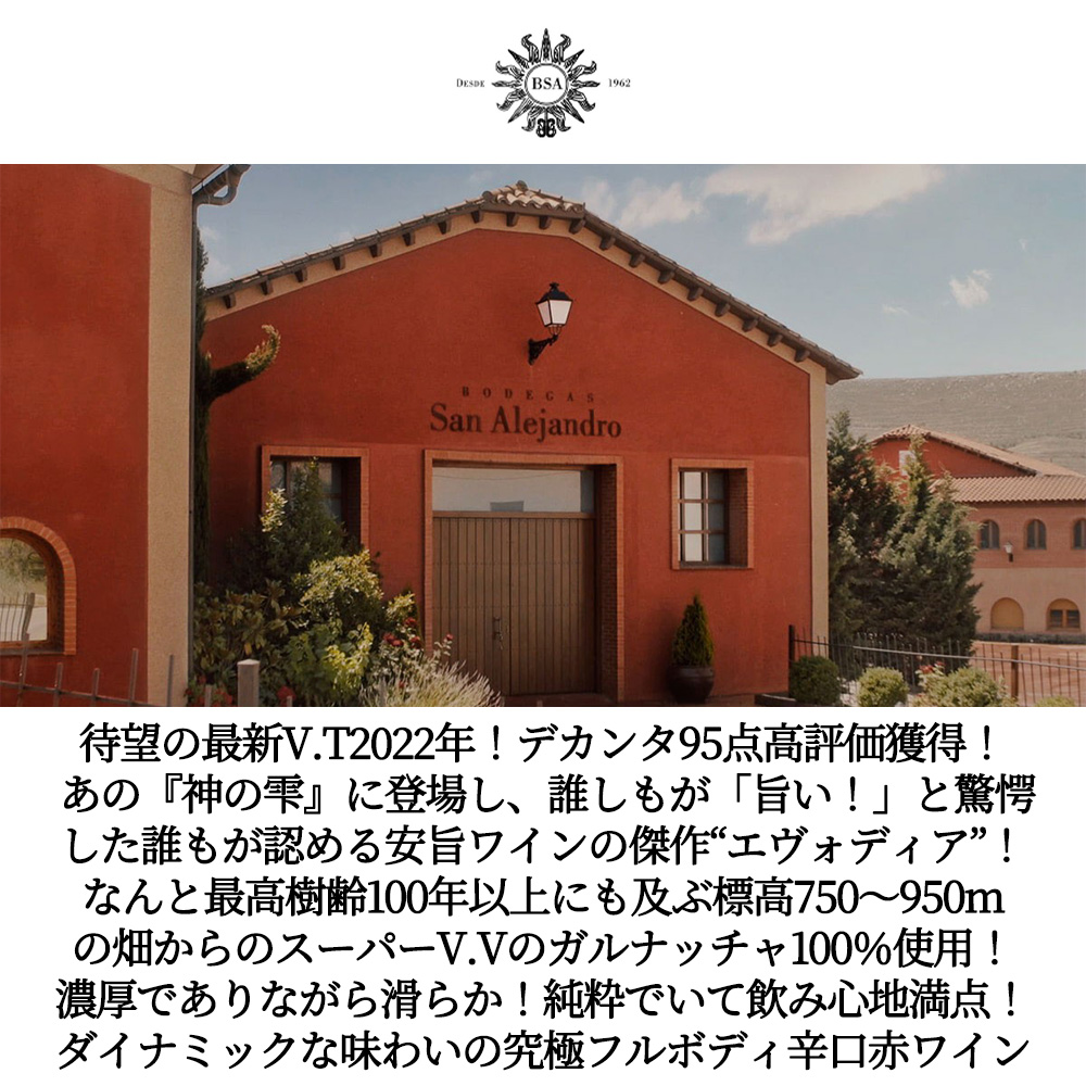 エヴォディア[2022]年・D.Oカラタユド・アルトビヌム(ボデガス・サン・アレハンドロ社)・最高樹齢100年以上のガルナッチャ90%にシラー10%・重厚ボトル・デカンタ誌驚異の95点獲得ワイン