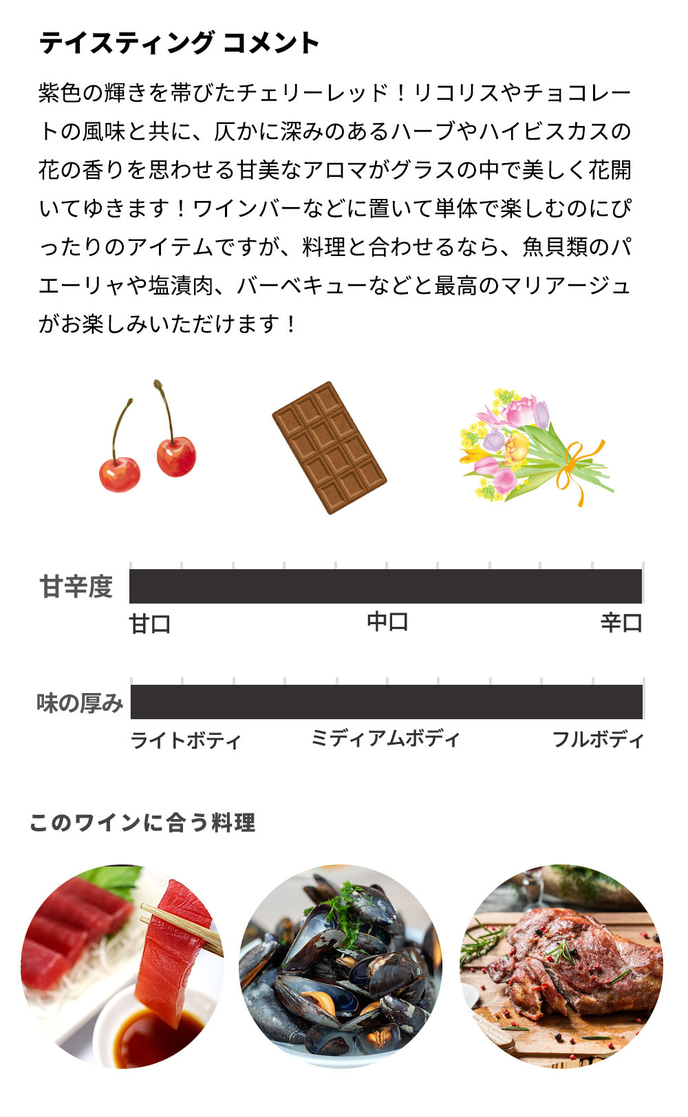 紫色の輝きを帯びたチェリーレッド!リコリスやチョコレートの風味と共に、仄かに深みのあるハーブやハイビスカスの花の香りを思わせる甘美なアロマがグラスの中で美しく花開いてゆきます!ワインバーなどに置いて単体で楽しむのにぴったりのアイテムですが、料理と合わせるなら、魚貝類のパエーリャや塩漬肉、バーベキューなどと最高のマリアージュがお楽しみいただけます!コスパ抜群の究極スパニッシュが待望入荷!