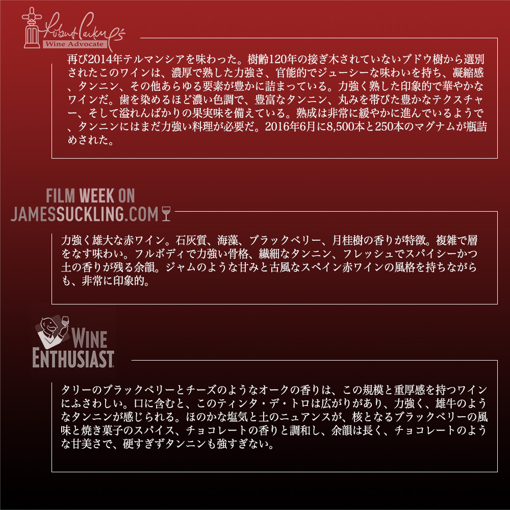 さらにワインアドヴォケイト誌94点でコメントは『再び2014年テルマンシアを味わった。樹齢120年の接ぎ木されていないブドウ樹から選別されたこのワインは、濃厚で熟した力強さ、官能的でジューシーな味わいを持ち、凝縮感、タンニン、その他あらゆる要素が豊かに詰まっている。力強く熟した印象的で華やかなワインだ。歯を染めるほど濃い色調で、豊富なタンニン、丸みを帯びた豊かなテクスチャー、そして溢れんばかりの果実味を備えている。熟成は非常に緩やかに進んでいるようで、タンニンにはまだ力強い料理が必要だ。2016年6月に8,500本と250本のマグナムが瓶詰めされた。』!