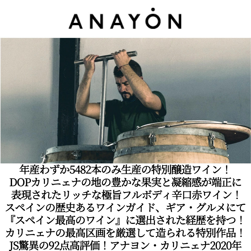 アナヨン・カリニェナ[2020]年・グランデ・ビニョス・イ・ビニェドス社・DOPカリニェナ・ジェームス・サックリング驚異の92点&ペニン・ガイド91点・オークのバリック樽100%で10ヶ月熟成・スペイン・カリニェナ産・赤・年産本数&ロットナンバー入り・ヴィーガン認証・14.5%