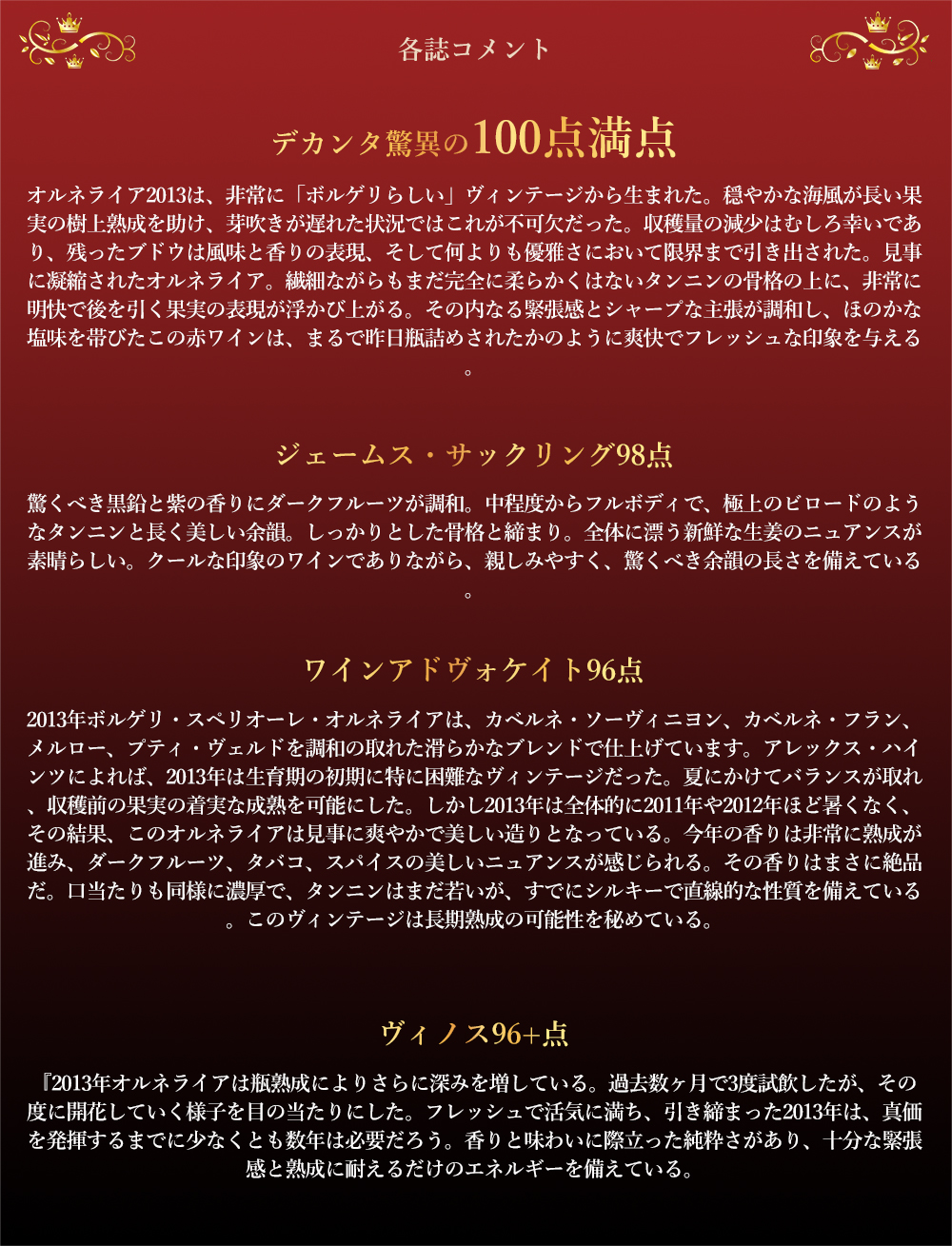 ワインアドヴォケイト96点でコメントは『2013年ボルゲリ・スペリオーレ・オルネライアは、カベルネ・ソーヴィニヨン、カベルネ・フラン、メルロー、プティ・ヴェルドを調和の取れた滑らかなブレンドで仕上げています。アレックス・ハインツによれば、2013年は生育期の初期に特に困難なヴィンテージだった。夏にかけてバランスが取れ、収穫前の果実の着実な成熟を可能にした。しかし2013年は全体的に2011年や2012年ほど暑くなく、その結果、このオルネライアは見事に爽やかで美しい造りとなっている。今年の香りは非常に熟成が進み、ダークフルーツ、タバコ、スパイスの美しいニュアンスが感じられる。その香りはまさに絶品だ。口当たりも同様に濃厚で、タンニンはまだ若いが、すでにシルキーで直線的な性質を備えている。このヴィンテージは長期熟成の可能性を秘めている。』!