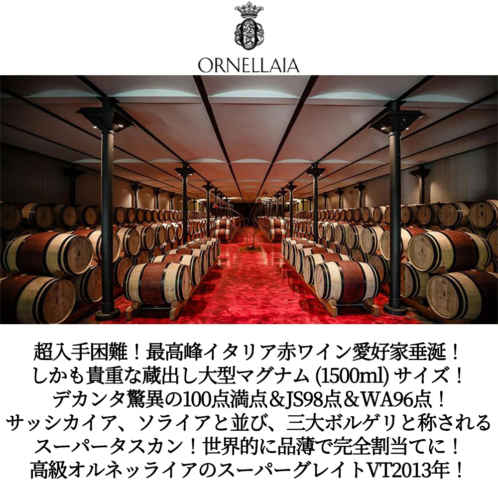 超入手困難!世界的に品薄で完全割当てになっている希少アイテム!高級イタリア辛口フルボディ赤ワイン愛好家大注目!オルネッライアファン垂涎!しかも貴重な蔵出し大型マグナムサイズ!しかも高評価のスーパーグレイトヴィンテージ[2013]年 (ワインアドヴォケイトでもボルゲリに驚異の95点を付けるスーパーグレイトヴィンテージ) で遂に入荷!世界の目をトスカーナに向けさせ、ボルゲリの頂点に君臨するスーパーワイン!オルネッライア!
