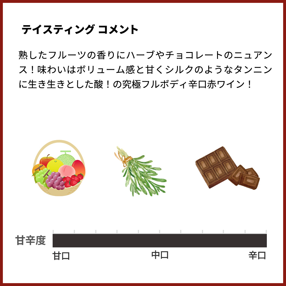 - ブドウ品種カベルネ・ソーヴィニヨン45%、メルロ38%、カベルネ・フラン10%、プティ・ヴェルド7%