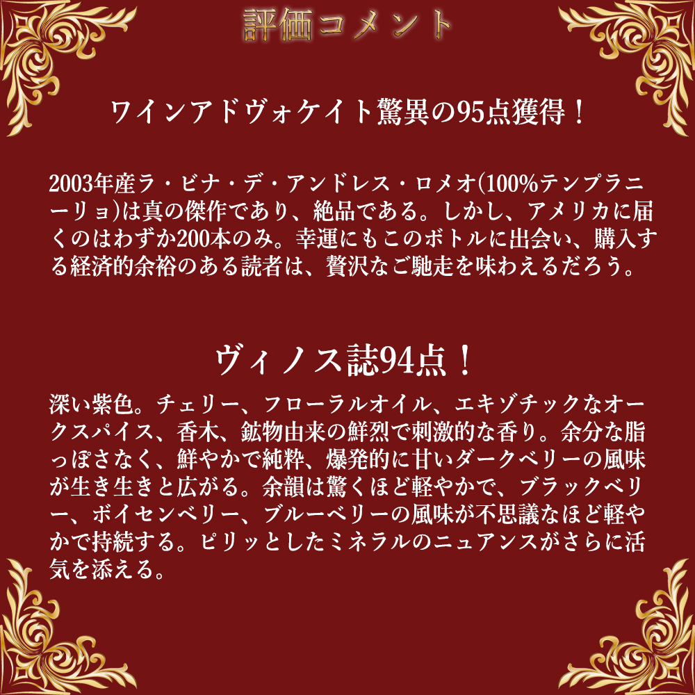 この2003年にワインアドヴォケイト驚異の95点でコメントは『2003年産ラ・ビナ・デ・アンドレス・ロメオ(100%テンプラニーリョ)は真の傑作であり、絶品である。しかし、アメリカに届くのはわずか200本のみ。幸運にもこのボトルに出会い、購入する経済的余裕のある読者は、贅沢なご馳走を味わえるだろう。』と激賞!