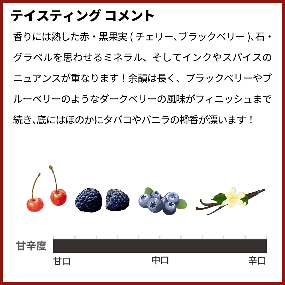 ヴィノス誌94点でコメントは『深い紫色。チェリー、フローラルオイル、エキゾチックなオークスパイス、香木、鉱物由来の鮮烈で刺激的な香り。余分な脂っぽさなく、鮮やかで純粋、爆発的に甘いダークベリーの風味が生き生きと広がる。余韻は驚くほど軽やかで、ブラックベリー、ボイセンベリー、ブルーベリーの風味が不思議なほど軽やかで持続する。ピリッとしたミネラルのニュアンスがさらに活気を添える。』!