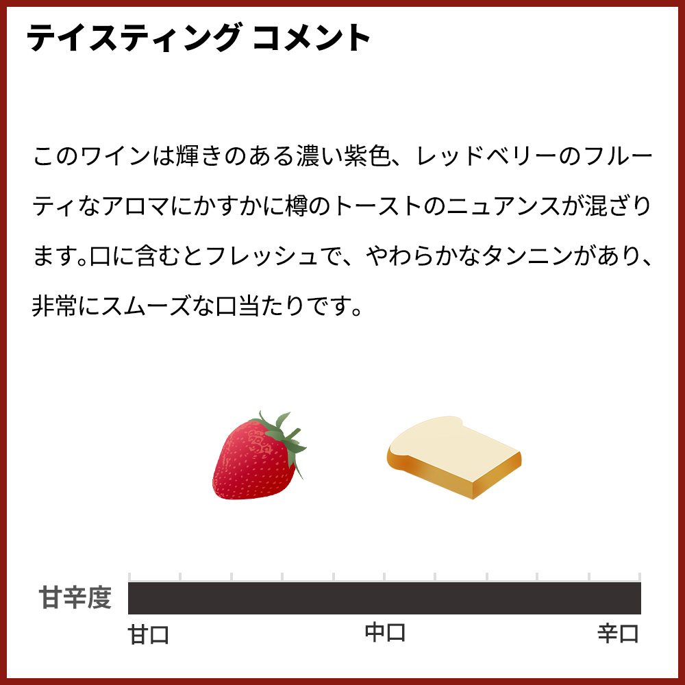このワインは輝きのある濃い紫色、レッドベリーのフルーティなアロマにかすかに樽のトーストのニュアンスが混ざります。口に含むとフレッシュで、やわらかなタンニンがあり、非常にスムーズな口当たりです。