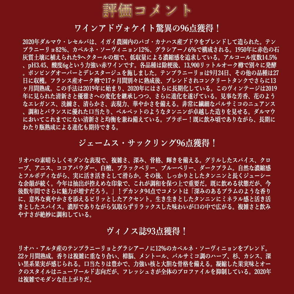 ヴィノス誌93点でコメントは「リオハ・アルタ産のテンプラニーリョとグラシアーノに12%のカベルネ・ソーヴィニョンをブレンド。22ヶ月間熟成。香りは複雑に重なり合い、樟脳、メントール、バルサミコ調のハーブ、杉、カシス、深い黒系果実が感じられる。口当たりは豊かで、力強い核と大胆な骨格を備える。凝縮した果実味とオークのスタイルはニューワールド志向だが、フレッシュさが全体のプロファイルを抑制している。2020年は複雑でモダンな仕上がりだ。」!と高評価!