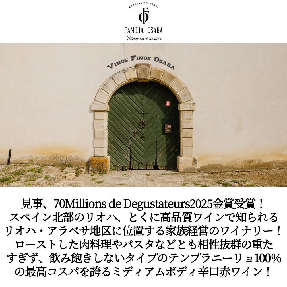 スペイン北部のリオハ、とくに高品質ワインで知られるリオハ・アラベサ地区に位置する1964年から歴史のある家族経営のワイナリー!代々受け継がれてきた畑を基盤に、伝統的な栽培と近代的な醸造技術を融合させたワイン造りを行うボデガス・ファミリア・オサバ!現在はバレンシアやナバーラ、リベラ・デル・ドゥエロなどでも高品質なワインを生産しています!