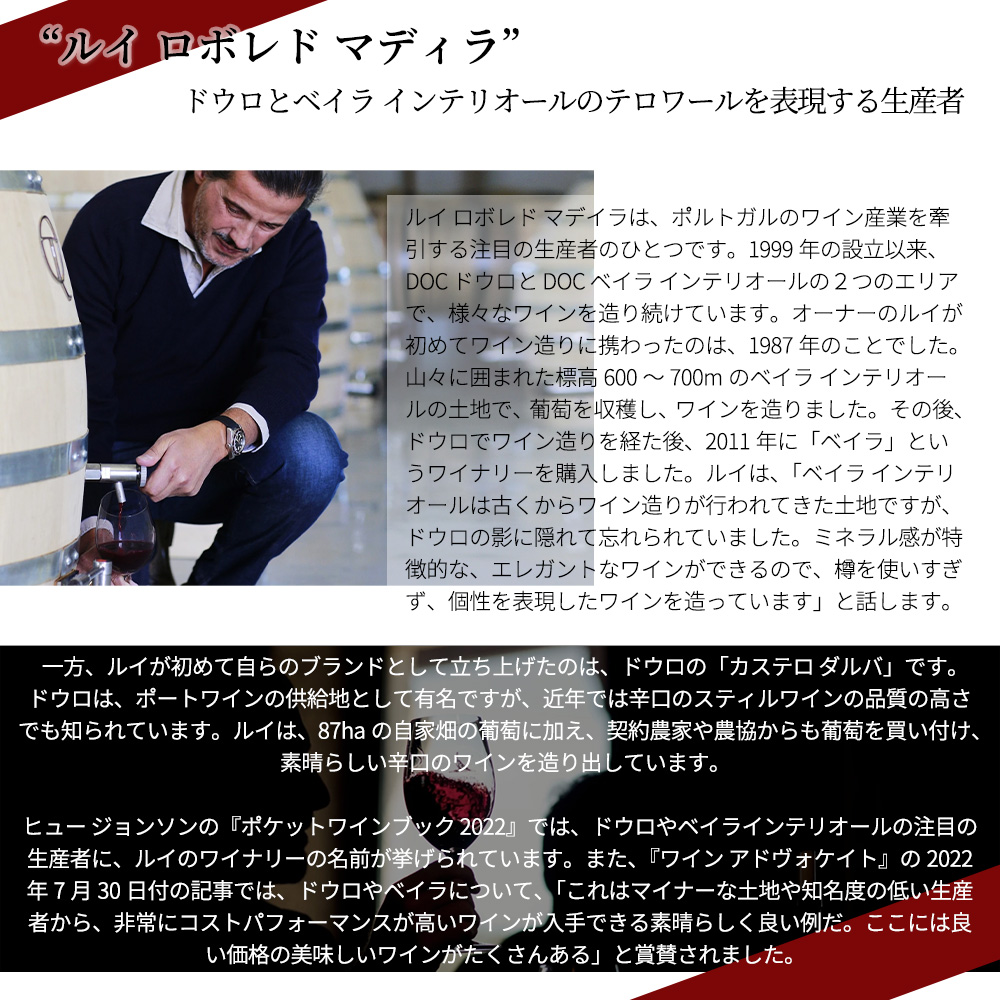 - 生産者ルイ・ロボレド・マデイラ元詰 (オーナー兼エノロゴ、ルイ・ロボレド・マデイラ家)