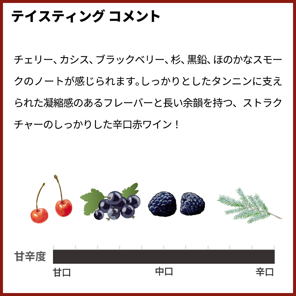 チェリー、カシス、ブラックベリー、杉、黒鉛、ほのかなスモークのノートが感じられます。しっかりとしたタンニンに支えられた凝縮感のあるフレーバーと長い余韻を持つ、ストラクチャーのしっかりした辛口赤ワイン!傑作カベルネ・ソーヴィニヨンが高評価ヴィンテージ[2022]年で待望入荷!