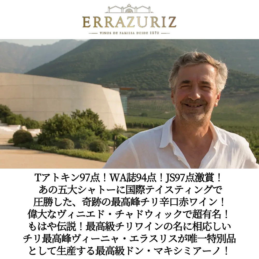 入手困難!高級チリ・フルボディ辛口赤ワイン愛好家大注目!世界のワイン愛好家大注目!銘醸エラスリスが唯一特別品として生産する、近年著しい品質向上の評価を得ているコレクター垂涎のアイテム!あの五大シャトー (ラフィットやラトゥール、マルゴー) に国際テイスティングで圧勝した奇跡の最高峰チリワイン!偉大なヴィニエド・チャドウィックで超有名!1870年創業で140年以上の歴史を誇るチリの名門エラスリス社 (チリの大統領を4人輩出してきた名家) !