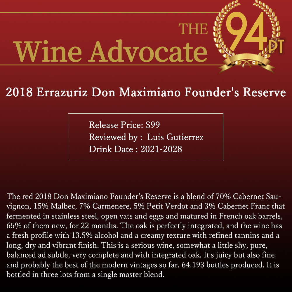 この2018年でティム・アトキン驚異の97点!ジェームス・サックリング96点!ワインアドヴォケイト誌94点でコメントは「赤の2018年ドン・マキシミアーノ・ファウンダーズ・リザーヴは、カベルネ・ソーヴィニヨン70%、マルベック15%、カルメネール7%、プティ・ヴェルド5%、カベルネ・フラン3%のブレンドで、ステンレス、開放タンク、卵で発酵させ、フレンチオーク樽(うち65%は新樽)で22カ月熟成させた。オークの香りは完璧に溶け込んでおり、フレッシュでアルコール度数13.5%、クリーミーなテクスチャー、洗練されたタンニン、長くドライで力強いフィニッシュを持つ。ピュアでバランスが取れており、繊細で、非常に完成度が高く、オークが溶け込んでいる。ジューシーだが繊細でもあり、おそらく今までのモダン・ヴィンテージの中でベストだろう。1つのマスターブレンドから3つのロットでボトリングされている。」!