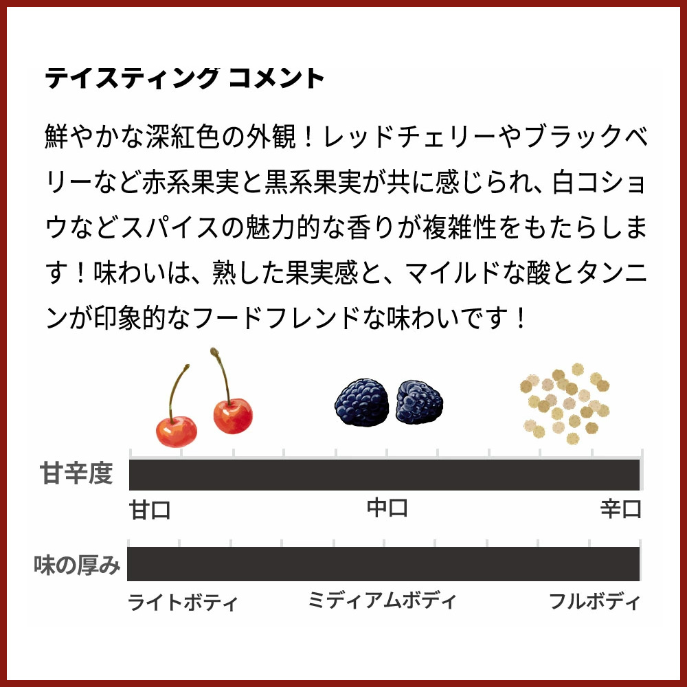 ニューサウスウェールズ州のリヴェリナにあるヘムリーヴィンヤードからのシラーズ88.8%、プチ・ヴェルド11.2%を使用!鮮やかな深紅色の外観!レッドチェリーやブラックベリーなど赤系果実と黒系果実が共に感じられ、白コショウなどスパイスの魅力的な香りが複雑性をもたらします!味わいは、熟した果実感と、マイルドな酸とタンニンが印象的なフードフレンドな味わい!