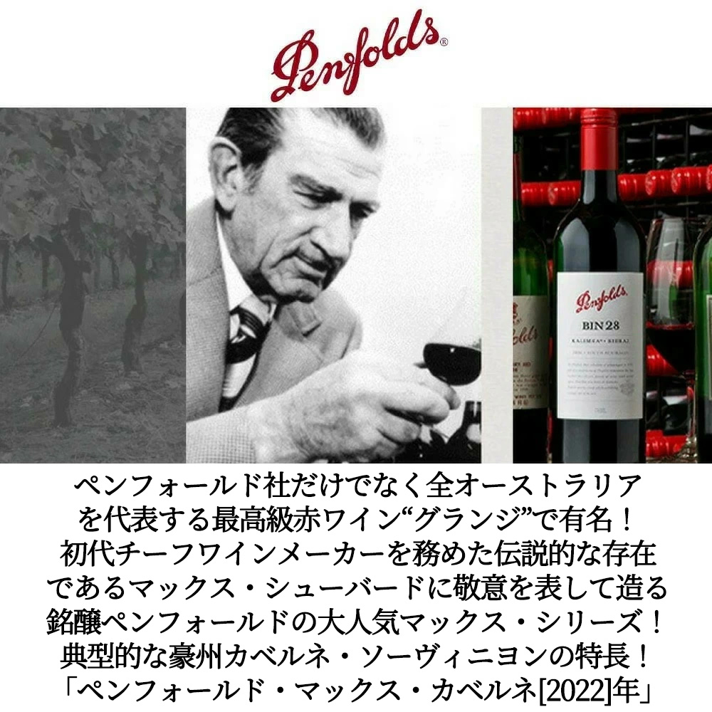 高級オーストラリア フルボディ辛口赤ワイン愛好家大注目!大人気ペンフォールドの大人気マックス・シリーズが登場!ペンフォールズ社といえば、世界最高峰ワインのひとつであり、ボルドーの最高格付ワインと比肩しうるワイン!ペンフォールド社だけでなく全オーストラリアを代表する最高級赤ワイン“グランジ”で有名!1844年、イギリスから移住してきた医師クリストファー・ローソン・ペンフォールド博士が南オーストラリア州マギルで、妻メアリー夫人と共に医療用として酒精強化ワイン造りを開始したのが、ペンフォールズの始まり!1870年にクリストファー・ローソンが亡くなってから、彼の妻メアリー、義理の息子トーマス・フランシス・ハイランドが跡継ぎとなり、オーストラリア国内のワインマーケットを拡大し続けました!1950年代、消費者の嗜好の変化を反映してスティルワインにフォーカスしたワイン造りへ転向したペンフォールズは、レイ・ベックウィズ博士や、『グランジ』を生み出した初代チーフワインメーカー、マックス・シューバートなどの熱意あふれる偉人たちによって支えられ、格別かつ大胆なワイナリーへと発展!創設から約180年を経たペンフォールズは、比類なき傑出したニューワールドワインとして世界中で認められ、ワイン&スピリッツ誌の『ワイナリー・オブ・ザ・イヤー』を歴代最多の30回受賞するなど多数の受賞歴とともに、世界最高峰のワイナリーの一つとして知られるようになりました!このペンフォールド(ペンフォールズ)・マックスシリーズは、1948年~1975年の初代チーフワインメーカーを務めた、ペンフォールズの伝説的な存在であるマックス・シューバードに敬意を表して造られたワイン!それぞれのワインには葡萄の特長、魅惑的な香りとフレーバー、ストラクチャーが表現されています!このペンフォールド(ペンフォールズ)・マックス・シラーズ[2022]年は厳選したカベルネ・ソーヴィニヨン主体に一部シラーズをアメリカンオーク10%、フレンチオークホグスヘッド10%で樽熟成!残りはアメリカンオークとフレンチオークで熟成!このワインには純粋なヴァラエタルとしてのカベルネ・ソーヴィニヨンの際立った特長があります!土、葉のような香りと、ブルーベリー、ストロベリー、ザクロなどの果実の香り!オーク由来のヘーゼルナッツの風味を持ち、味わいに心地よいクリーミーさと重厚さを与えています!しっかりとしたタンニンも楽しめます!ワイナリーのテイスティングコメントは「色:鮮やかなチェリーレッド。香り:軽くスワリングすると、品種の特徴がグラスから飛び出す。砕いた桑の葉と木化した月桂樹の葉の古典的なカベルネのノート。ほこりっぽいココアパウダー、カシアとスターアニスのウッディなスパイス。ブラックベリーとブランブルの果実は、品種のスペクトルの熟した端に心地よく座っている。非常に魅力的。味わい: 口に含むと、クラシックな品種のルバーブの活力がすぐに感じられ、ダークフルーツの風味に支えられている。すりおろしたばかりのビーツ、フレッシュミント、サマープディング、ホイップクリームを思わせる土っぽいニュアンスが甘い果実味とバランスをとっている。カシューナッツとクルミのオーク由来のニュアンスがテクスチャーを与え、繊細なレースのようなタンニンによく支えられている。」と大注目!大人気ペンフォールズ社が誇る大人気マックス・シリーズのカベルネ・ソーヴィニヨンが正規代理店輸入品で待望入荷!