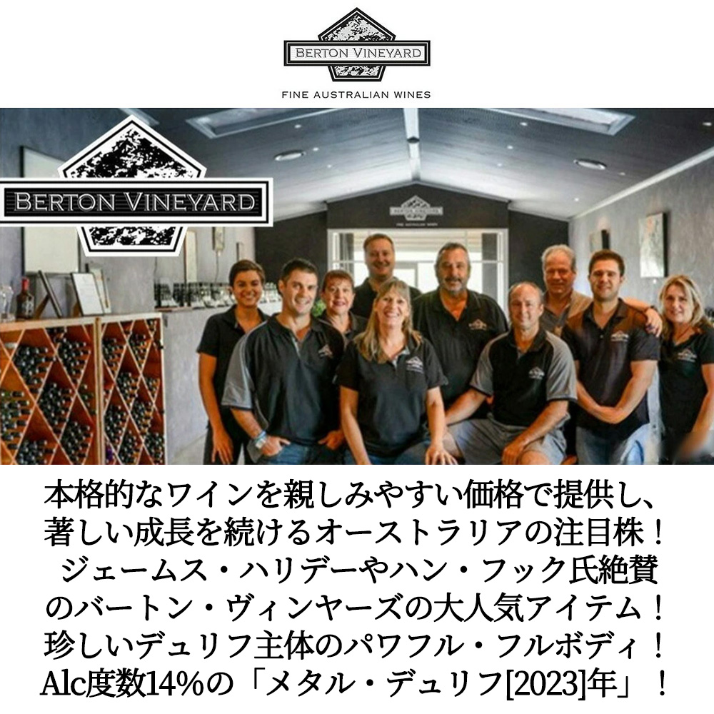 バートン・ヴィンヤーズではこの素晴らしい国で培われた、優れたブドウ栽培実績を更に際立たせるような、エキサイティングで多彩なワインを産み出してきました!造り手は、1996年創立者であるボブ・バートン氏とチャーリー・バートン氏が南オーストラリア州バロッサヴァレーのサブリジョンであるハイ・エデンの一区画の畑を購入したことから始まり、2005年にはシドニーの南西、ニューサウスウェールズ州イェンダの地で「バートン・ヴィンヤーズ」を設立(ハイ・エデンに45エーカーの自社畑を所有)!現在ではオーストラリア20大ワイナリーの一つに数えられ、ブランド売り上げではTop17に名を連ねるまでに急成長!2013年版ジェームス・ハリデーで4.5つ星評価を獲得!オーストラリアで最も影響力を持つ評論家の一人、ハン・フック氏も絶賛!のバートン・ヴィンヤーズによる珍しいデュリフ主体でステンレスタンクで4ヶ月(オークスティーヴ使用)、一部オーク樽で4ヶ月(フランス産/旧樽/300L)のパワフルなフルボディ辛口赤ワイン!