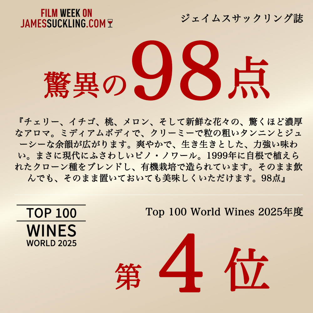 しかも自社畑100%&元詰100%のこのミステリアス・ディギングス・ピノ・ノワール[2024]年・テラ・サンクタでジェイムスサックリング驚異の98点& ”Top 100 World Wines 2025年度”第4位獲得!大絶賛コメントは『チェリー、イチゴ、桃、メロン、そして新鮮な花々の、驚くほど濃厚なアロマ。ミディアムボディで、クリーミーで粒の粗いタンニンとジューシーな余韻が広がります。爽やかで、生き生きとした、力強い味わい。まさに現代にふさわしいピノ・ノワール。1999年に自根で植えられたクローン種をブレンドし、有機栽培で造られています。そのまま飲んでも、そのまま置いておいても美味しくいただけます。98点』と大注目!!さらには”Top 100 World Wines 2025年度”でも第4位獲得!