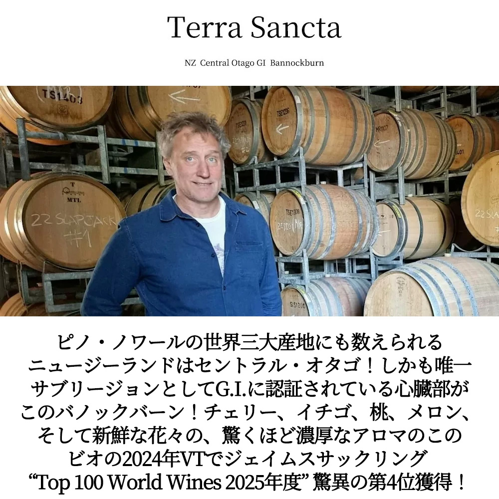 ニュージーランド・ピノノワール種100%辛口赤ワイン愛好家大注目!このワインでジェイムスサックリング驚異の98点&さらに Top 100 World Wines 2025年度”第4位獲得ワイン!ブルゴーニュ辛口赤ワイン愛好家も大注目!ピノ・ノワールの世界三大産地にも数えられるセントラル・オタゴ!しかも唯一サブリージョンとしてG.I.に認証されている心臓部がこのバノックバーン。しかもこの地に最初に葡萄を植えた歴史あるワイナリーとして知られるテラ・サンクタ社 (ピノ・ノワールの世界三大産地として有名なセントラル・オタゴの老舗。歴史に裏打ちされた経験と技術をもとに、著名な評論家から賞賛を受ける注目の名手。セントラル・オタゴのGIバノックバーンは緯度46度にあり、この高緯度が長い日照時間をもたらし、ワインにストラクチャーを与え、よりシルキーでベルベットのようなテクスチャーを生み出している。) は歴史に裏打ちされた経験とその技術で、ボブ・キャンベルやジェームス・サックリングなど著名なワイン評論家から素晴らしい賞賛を受けています。